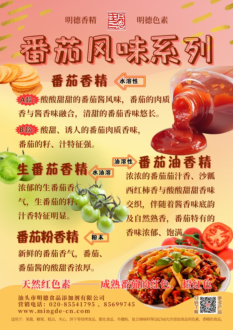 明德番茄風(fēng)味系列香精 酸甜鮮爽 覆蓋多樣應(yīng)用場(chǎng)景汕頭市明德食品添加劑有限公司推出的番茄風(fēng)味系列香精,覆蓋水溶性、油溶性與粉末香精,兼顧番茄醬、鮮番茄與成熟番茄等多種風(fēng)味調(diào)性。產(chǎn)品真實(shí)穩(wěn)定,適用于飲料、醬料、烘焙、休閑等多種B端場(chǎng)景。
