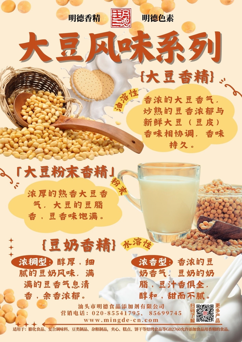 如需獲取不同版本風(fēng)味樣品或配方方案,歡迎聯(lián)系明德團隊。我們致力于為食品工廠提供真實、安全、高性價比的香精解決方案。汕頭市明德食品添加劑有限公司推出的大豆風(fēng)味系列香精,覆蓋大豆香精、大豆粉末香精、豆奶香精等多種調(diào)性,風(fēng)味真實,留香穩(wěn)定,適用于膨化休閑、復(fù)合調(diào)味、豆制品及飲料等B端工廠,幫助快速打造具有記憶點的大豆類風(fēng)味。