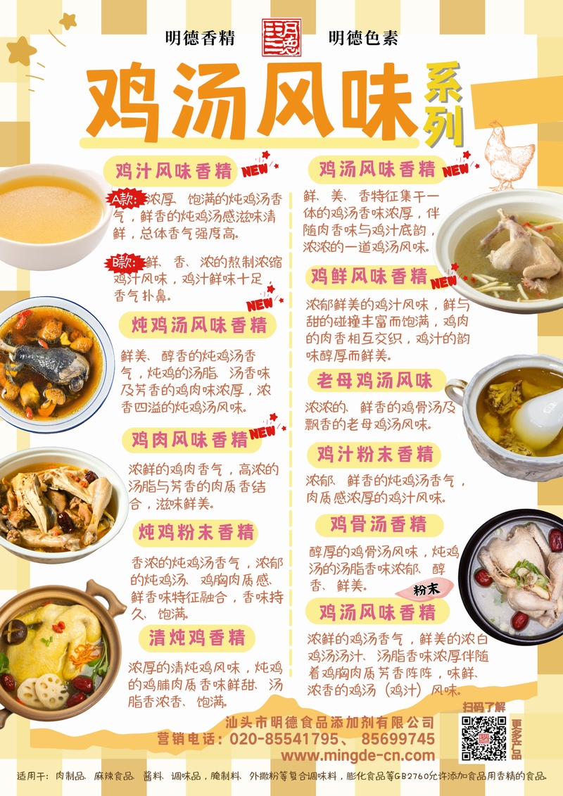 明德雞湯風味香精 濃郁鮮香 還原地道雞湯本味汕頭市明德食品添加劑有限公司的雞湯風味香精系列,涵蓋雞汁、雞湯、雞鮮風味、老母雞湯、雞肉風味、雞粉末、雞骨湯、清燉雞等多種品類。產(chǎn)品具備真實的雞肉鮮香、湯香、油香與骨香特征,能夠為醬料、調味品、肉制品、腌制料及復合調味料等B端應用提供穩(wěn)定、濃郁的雞湯風味解決方案,幫助工廠快速打造風味醇厚、回味悠長的雞香產(chǎn)品。